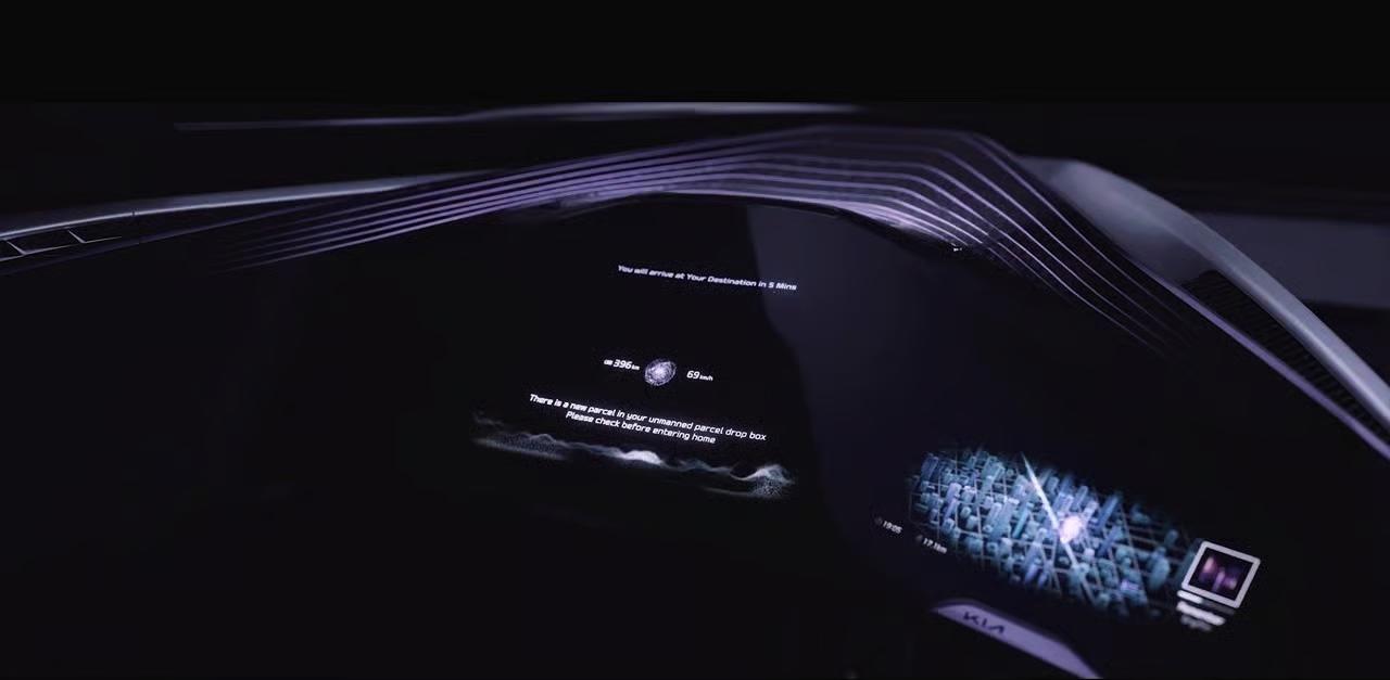 One of the most prominent features of the cabin is the ‘cockpit’ area surrounding the driver. The graphical user interface (GUI) of the cockpit flows out of the driver-side door and wraps around the steering wheel in a seamless arc. This merges the instrument cluster directly with the audio-visual display at the center of the dashboard and is linked to the display integrated within the surface of the steering wheel itself.